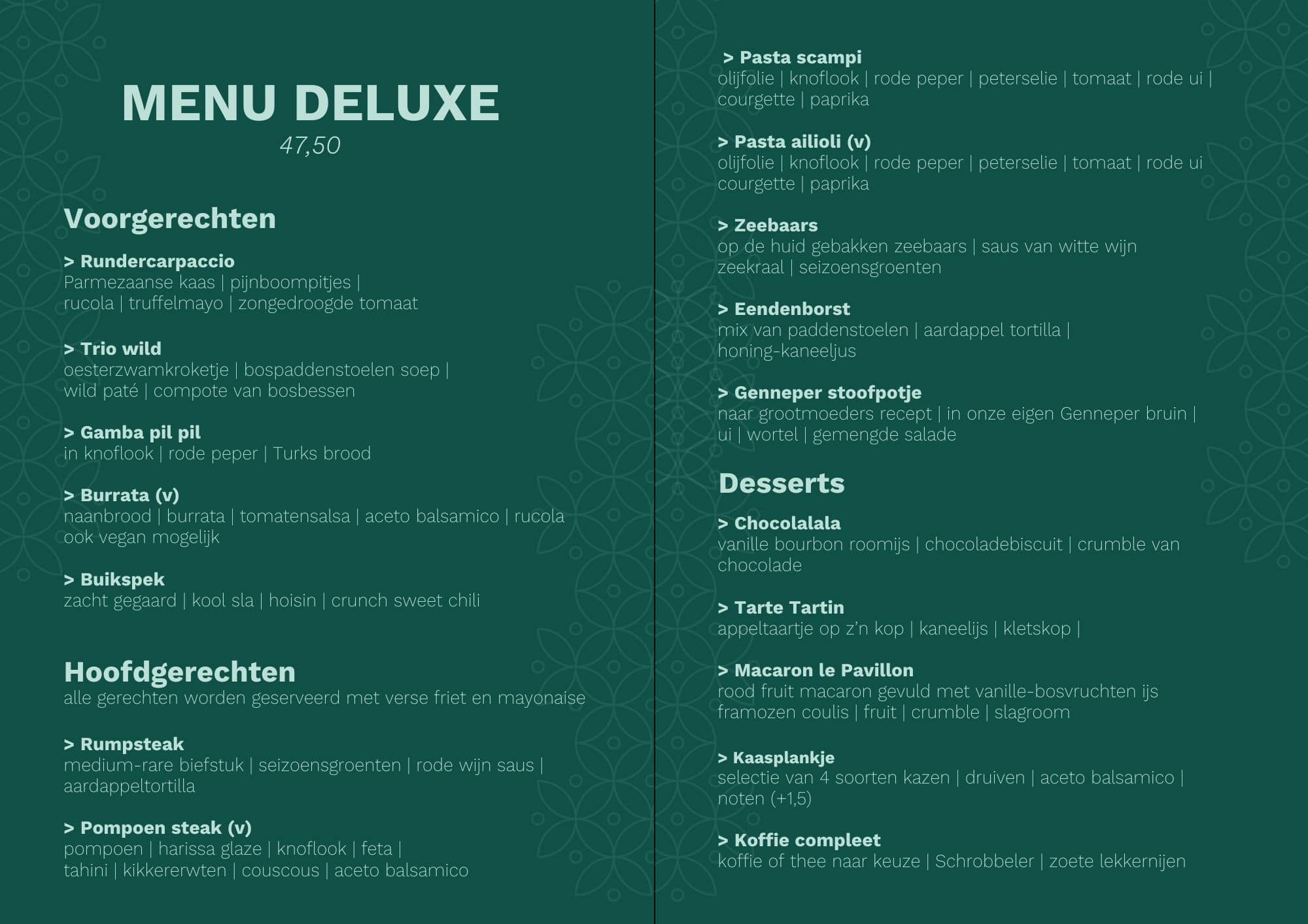 > Voor groepen tot 10 personen kun je kiezen van de à la carte dinerkaart of 2 verschillende 3-gangenmenu’s al vanaf €32.5 p.p.
